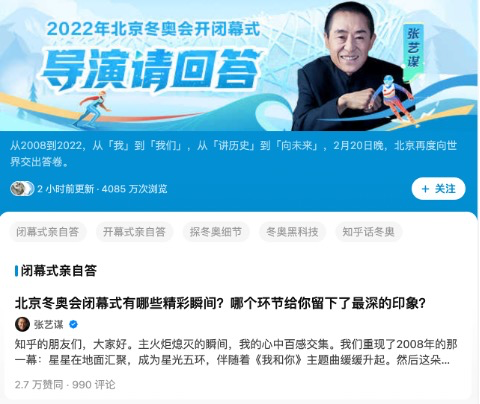 2 月 4 日晚,知乎上关于冬奥会开幕式的一个问题瞬间刷屏,内容浏览量迅速超过 2100 万,并引来 3559 条回答。张艺谋导演首次社交媒体发声选择了知乎,详解了精彩绝伦的开幕式背后故事。在闭幕式结束后,他又再次带领导演团队揭秘闭幕式背后的精彩,给知乎冬奥传播划上了一个圆满的句号。