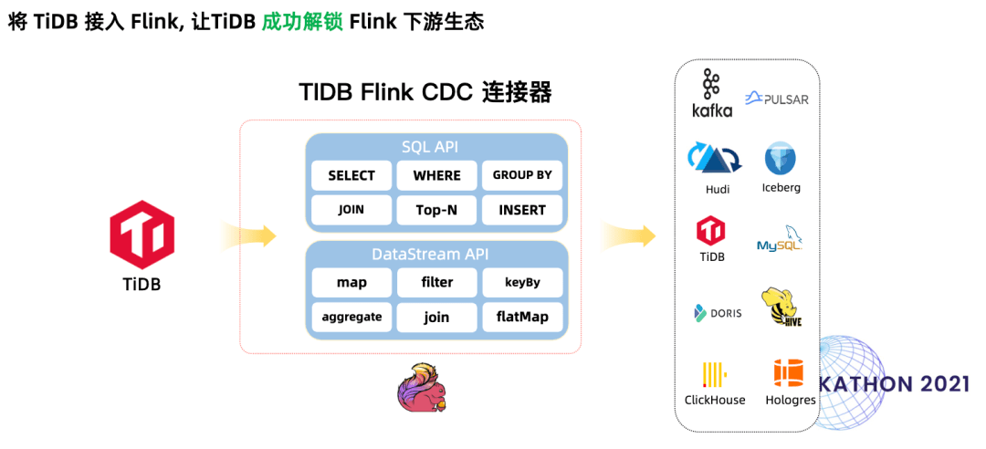 吴雪莲:项目的名字是才华横溢的子懿老师起的,包括我们的战队宣言,还有答辩 PPT,以及团队介绍视频都是他想的。项目的实现机制主要由雪尽老师提出,他平时就一直在做 Flink CDC 的工作,上游接了很多数据库,有很多 TiDB 用户就找过来问能不能支持一下 TiDB。恰好这时,我们看到 TiDB Hackathon 2021 开启报名,于是就决定带着这个项目参赛了。