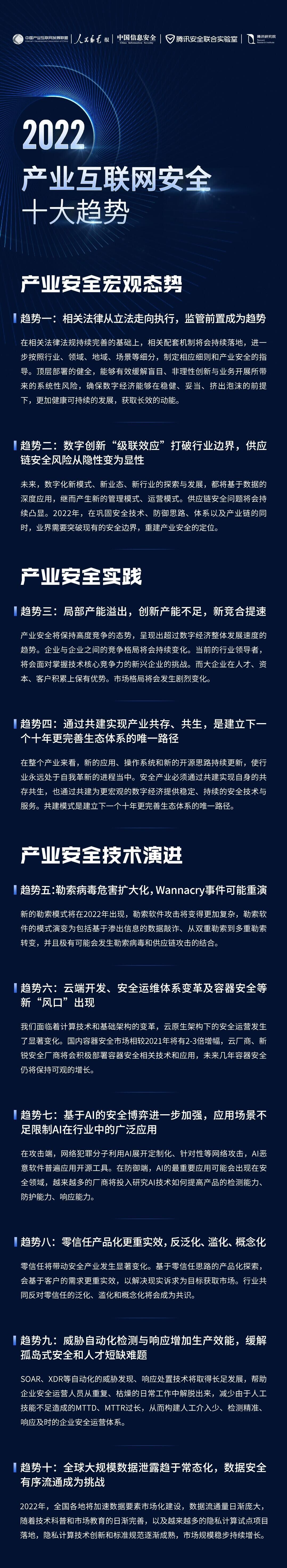 2 月 28 日,在中国产业互联网发展联盟指导下,人民邮电报、中国信息安全、腾讯安全联合实验室、腾讯研究院联合推出《2022 产业互联网安全十大趋势》。