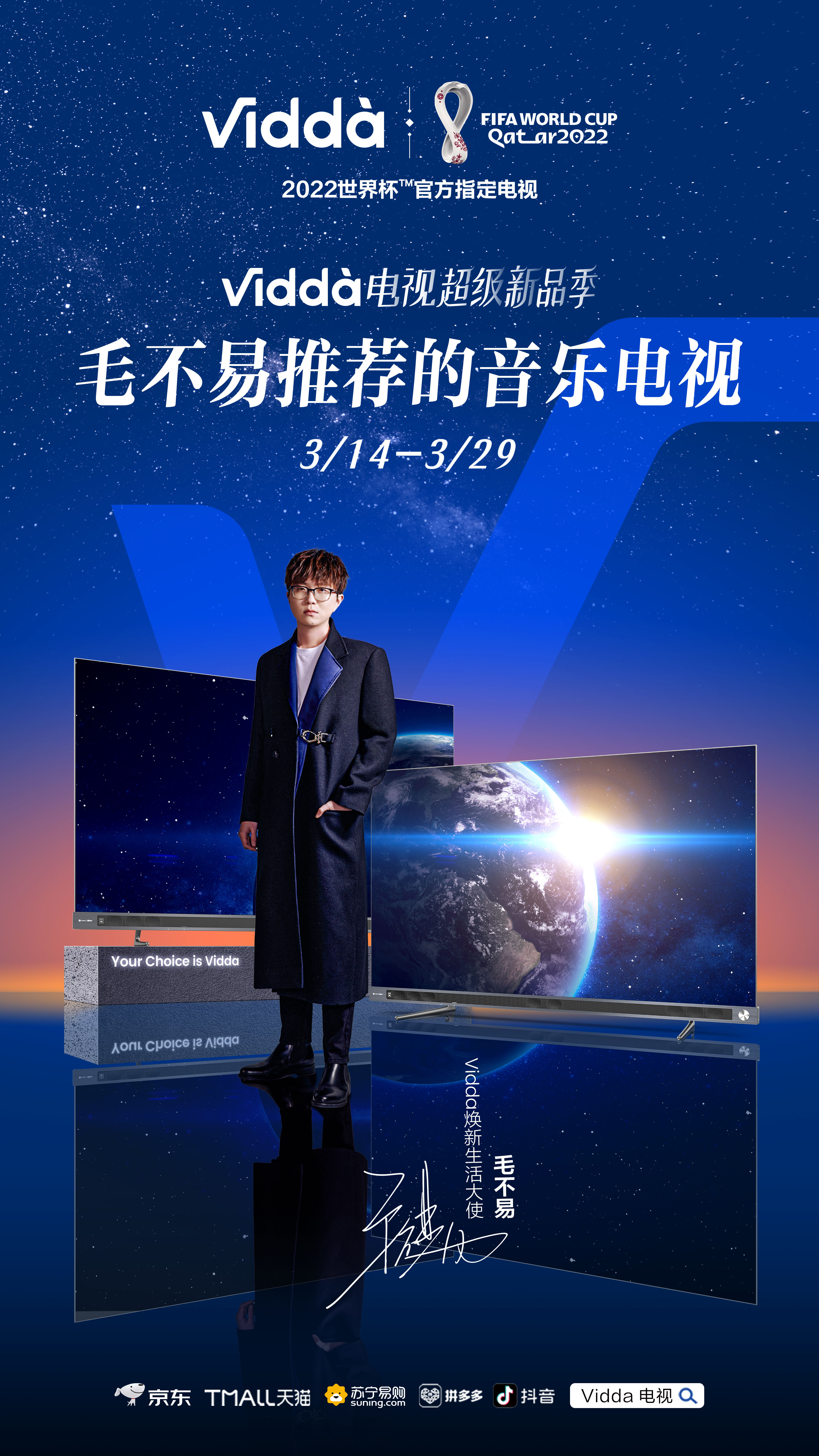 另一边,眼尖的网友发现毛不易海报背后的 Vidda 2022 世界杯官方指定电视也是一大亮点。据了解,这也是 Vidda 首次透露与世界杯的合作关系。
