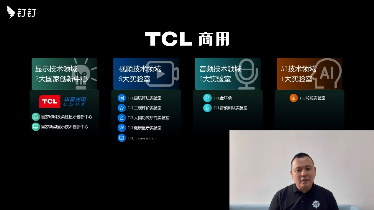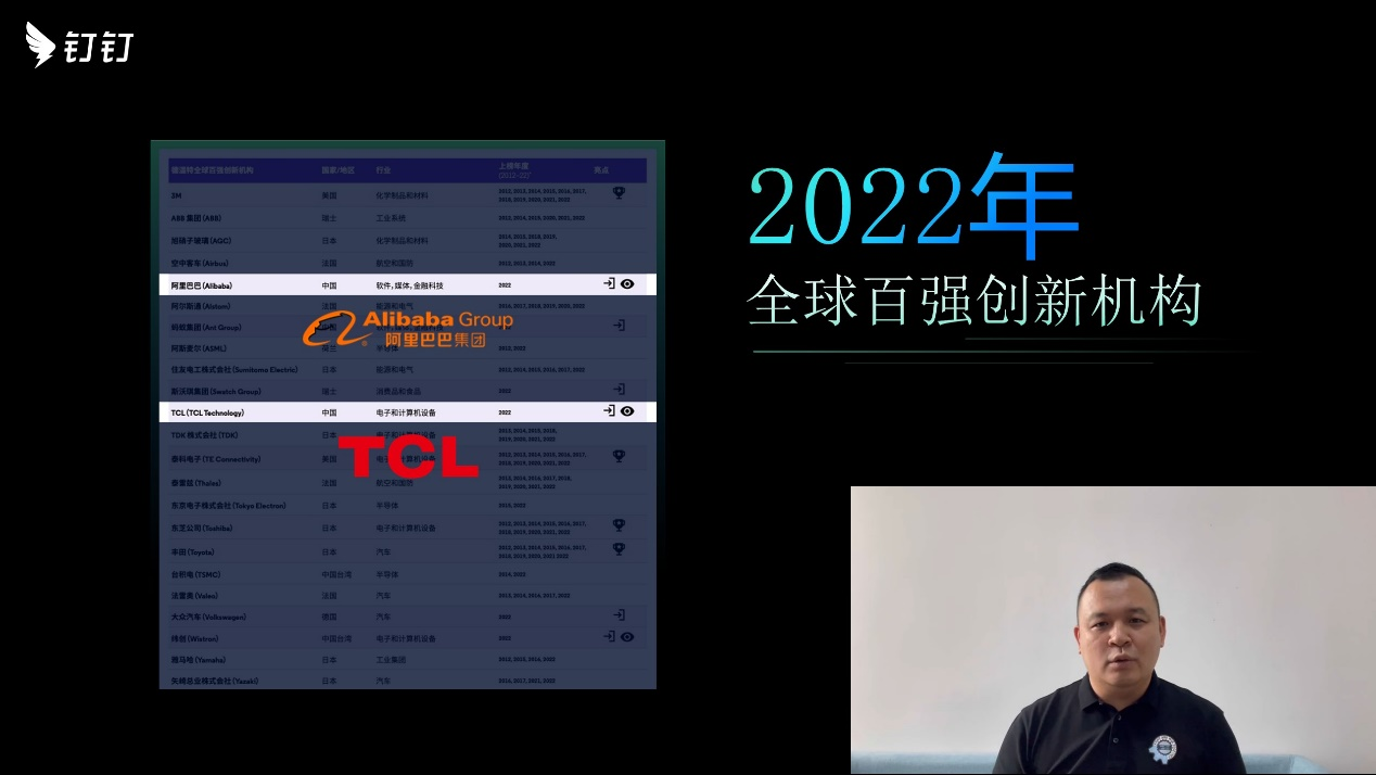 TCL 商用与钉钉的生态合作,源于双方身上共通的科技创新基因。科睿唯安上月公布的《2022 年度全球百强创新机构》榜单,中国有五家企业入选,TCL 与阿里双双入选。作为拥有三家上市公司的世界 500 强,TCL 多年来持续投入研发,布局全球研发体系,多项技术指标居全球第一阵营。TCL 商用依托 TCL 集团产业链综合优势,以前沿显示、智能交互、音视频、AI 和边缘计算为底层技术,整合行业生态链伙伴资源,为商用行业客户提供细分场景的智慧商显解决方案。