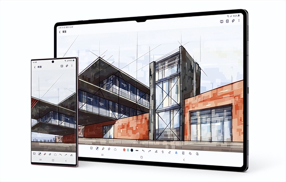 值得一提的是,这样的互联体验,还带来了全新的「协作视图」功能,即当我们在平板电脑上创作的时候,可以将 Galaxy S22 Ultra 的屏幕显示为工具栏或调色板,从而方便我们在平板电脑上专心致志地绘画创作。