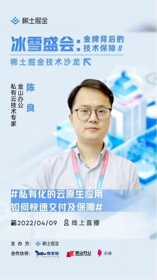 4 月 9 日,开发者社区稀土掘金主办的《冰雪盛会:金牌背后的技术保障》专题直播在线上与大家见面。全球领先的办公软件产品和服务提供商、北京 2022 年冬奥会和冬残奥会官方协同办公软件供应商金山办公公司的私有云技术专家陈良将受邀出席本次技术直播,并与奇安信、微软小冰一道,分享盛大的冬奥会赛事背后的技术保障经验。