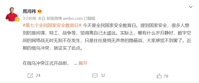 「没有和平的年代,只有和平的国家。坚定的贯彻落实总体国家安全观,是我作为一名在网络安全行业奋战十余年的老兵的使命担当。」4 月 15 日,在第七个全民国家安全教育日这天,三六零(601360.SH,如下简称「360「)创始人周鸿祎通过微博发文。他表示,「提到国家安全时,很多人想到的是间谍、特工、战争等,觉得离自己太遥远。但实际上,没有什么岁月静好,数字空间的网络战无时无刻不在发生,只是往往是悄无声息的隐蔽战,大家感觉不到罢了。」