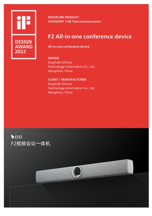 iF 设计奖在官网上指出,「随着 COVID-19 疫情的爆发,视频会议已经演变为一种更流行的办公协作和学习方式。这种体验的升级,要求远程会议的图像和声音更清晰,会议更稳定、流畅与智能,需要更强性能的硬件设备的支持。钉钉 F2 视频会议一体机具有 10 米清晰拾音距离、4K 超高清画质、更智能的会议指挥系统和会议控制系统,以及机械式镜头盖设计提升隐私感的特点,为高达 60 平米的会议空间提供极致视听保障。」