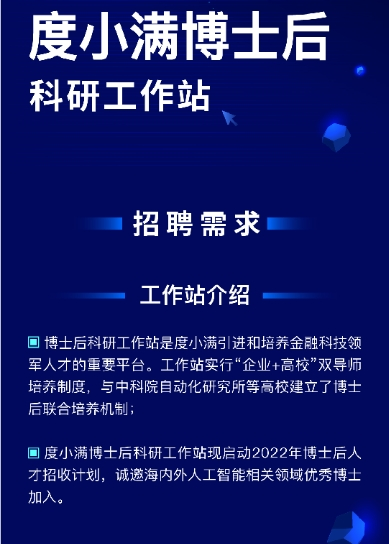 从度小满此次招聘来看, 主要聚焦在人工智能领域中的两大热门方向, 分别为情感计算和自然语言处理。在情感计算方面, 度小满博士后科研工作站的具体研究方向, 是基于人机交互语音数据、互联网行为数据以及金融业务场景丰富样本数据, 探索情感计算在金融领域的落地应用。