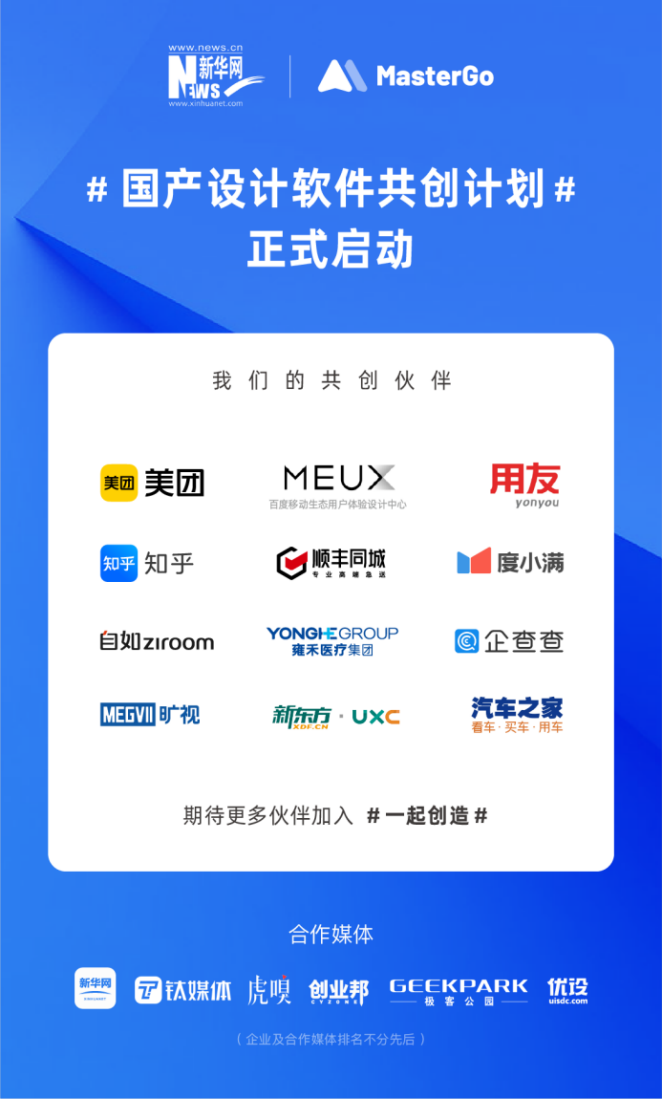 据了解,MasterGo 本次推出的「国产设计软件共创计划」将致力于解决开发者和使用者之间的断层沟通,快速实现以用户和以具有更高要求的头部企业需求为导向的产品迭代。截至发稿前,包括美团设计委员会、百度移动生态用户体验设计中心、用友网络、知乎、顺丰同城、度小满、旷视科技、新东方、汽车之家、自如、雍禾医疗、企查查等各行业头部企业都与其完成了签约。