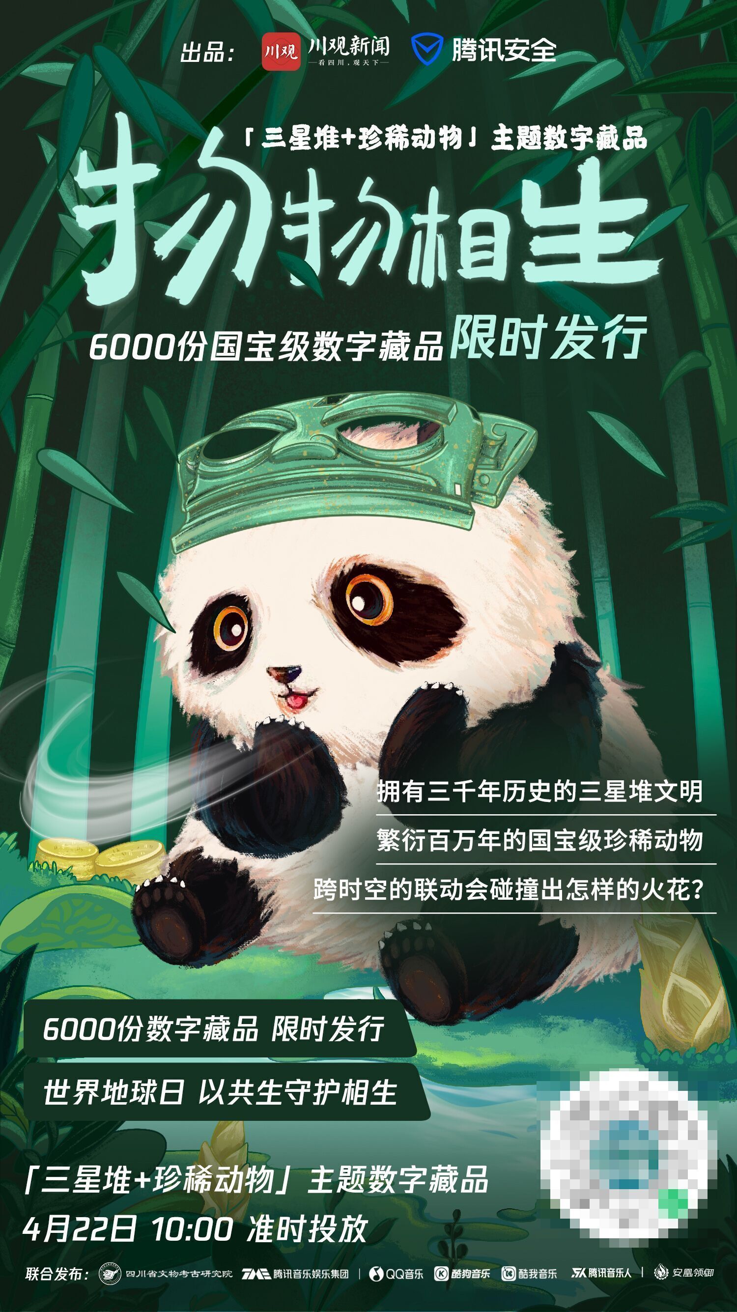 4 月 22 日,由腾讯安全与川观新闻发起、四川省文物考古研究院联合发布、三星堆 IP 授权,联袂 6 大青年艺术家共同呈现的《物物相生》当珍稀动物遇上三星堆主题数字藏品正式发布,全球限时发行 6000 份,上线即被抢空。