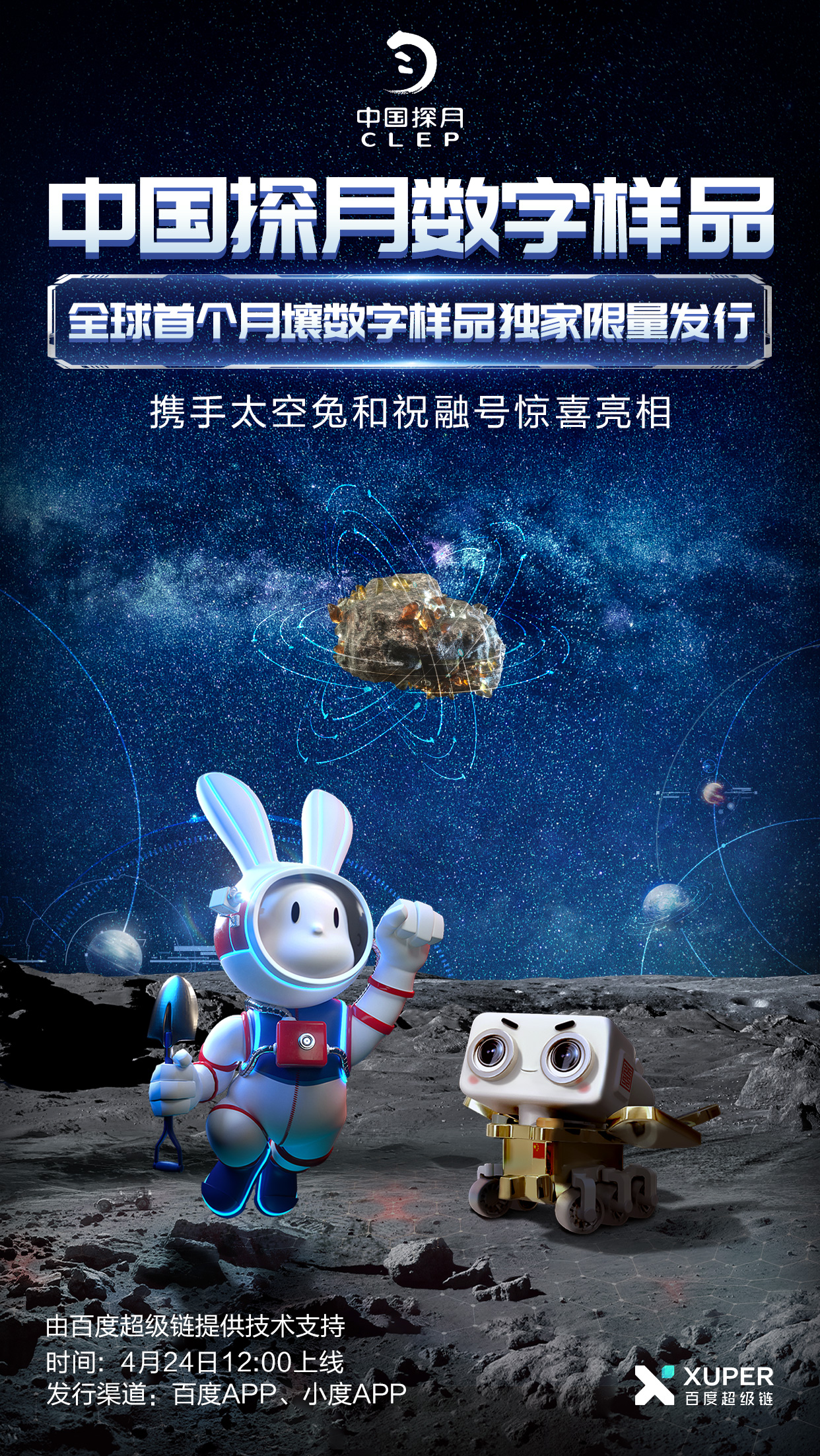 目前,月壤数字样品发行信息已在百度 App 及小度 App 上发布。根据发行信息,4 月 24 日中午 12:00,百度 App 与小度 App 各限量发行 1731 份月壤数字样品。此外,当日下午 16:00 开始,中国探月还将陆续发布「太空兔」、「祝融号」系列数字样品,灵感来源于我国第一辆火星车祝融号和第一辆月球车玉兔号。现在登陆百度 App 搜索「数字样品」或进入小度 App「寻宇」频道,即可查看详情或进行预约。