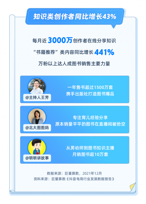 如何发现并购买一本适合自己的好书?达人推荐正在发挥越来越重要的作用,抖音兴趣电商则成为消费者选书和达人荐书的天然平台。报告显示,近年来越来越多的人通过抖音分享图书与知识,到 2021 年底,知识类内容月投稿人数已接近 3000 万,同比增长 43%。从创作内容上来,「书籍推荐」同比增长 441%,成为增幅最大的品类。