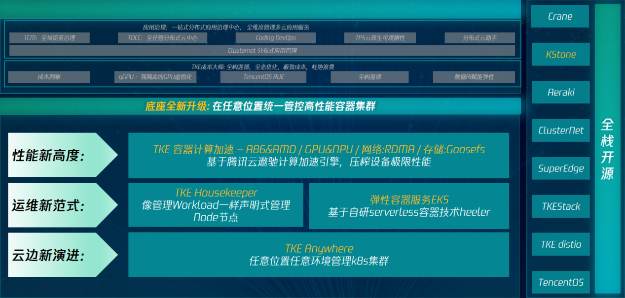 具体来说,在云边新演进方面,企业在上云过程中为了提高效率,往往会采用多云或混合 IT 战略,但随之而来的便是在公有云、私有云、边缘云等庞大基础设施下管理的复杂性和分散性。针对这一点,腾讯云推出全新能力——TKE Anywhere,可以让企业在任意环境、任意位置、任意集群,无差异的获取腾讯公有云原生的能力,实现多云资源的统一纳管。同时,腾讯云还将包括 Crane、KStone、Aeraki 在内近 10 种云原生分布式云技术栈全面开源,企业还可根据自身需求搭建一个良好的云原生底座。