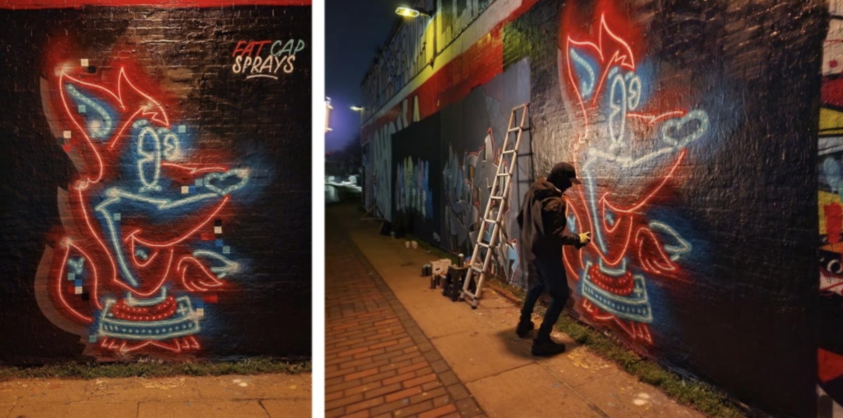 知名涂鸦艺术家 Fat Cap Sprays 因其独具特色的发光艺术作品而闻名。由于作品的发光特性,他通常遮光创作,因此整个创作过程和最终成果都难以被记录。