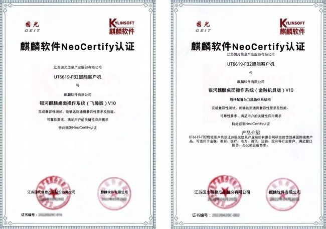 近日,麒麟软件有限公司(以下简称麒麟软件)与江苏国光信息产业股份有限公司 (以下简称江苏国光) 在金融机具国产化应用场景再一次强强联合深度探索。此次合作,双方基于银河麒麟操作系统(金融机具版)V10 和银河麒麟桌面操作系统 V10 共同适配验证完成了 UT6619-FB2 等 5 款智能客户机的兼容互认证,在龙芯平台、飞腾平台和兆芯平台完成了产品兼容性、功能性、性能及安全性测试。