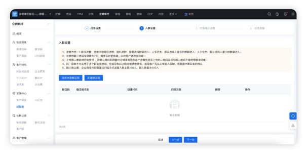 (1)任务设置:① 支持自动打标签:标签选可选择企微官方标签,也可以选择微盟企微助手的自定义标签,每个规则支持标签多选,满足更多个性化需求;
