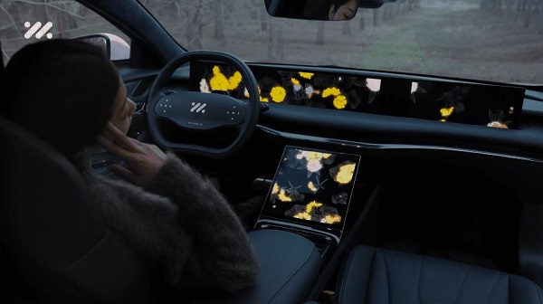 当前, 该项合作的技术已初步应用于上汽智己 L7 高端智能纯电轿车并量产,IMOS 首创的 teamlab 功能可全屏、跨屏呈现不同季节的繁花美景, 并支持点触交互, 花朵指尖绽放, 营造独有的沉浸感官体验。