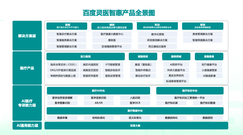 依托百度大脑的核心技术与 AI 能力,百度灵医智惠构建了行业领先的医疗 AI 中台、医疗知识中台和医疗数据中台,并在此基础上面向场景提供临床决策支持、眼底筛查、影像 AI 能力中台、智慧病案、智能审方、慢病管理、医疗大数据服务等全场景 AI 医疗解决方案,助力医院、赋能政府、造福患者及进行了深入实践。目前,灵医智惠全国范围内已经服务超过 500 家等级医疗机构,超过 3000 家的基层医疗机构,造福超过千万患者。通过持续不断向社会输出 AI 医疗能力,助力提升医疗行业的效率、质量。灵医智惠希望用科技改善医疗资源分布不均的现状,用 AI 实现优质医疗资源的普惠。