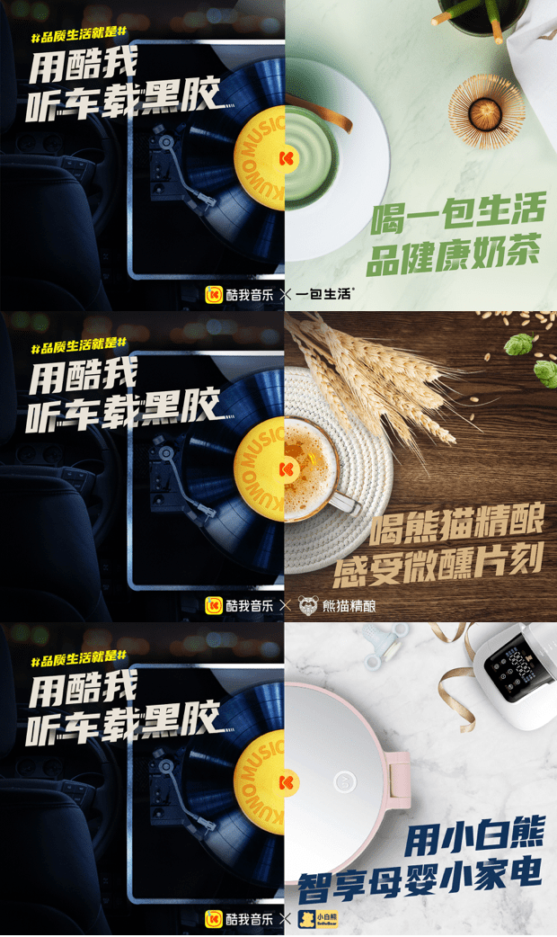 除了视觉表达的高度适配,酷我音乐与合作品牌在用户圈层上的交集与融合,是促成此次跨界合作的深层原因。酷我音乐车载一直致力于为用户提供高品质的车载音乐服务,推出车载黑胶产品即是对这一理念的体现,而蒙牛、小白熊、苏宁易购小家电等合作方也以为消费者提供更优质的产品,打造高品质生活方式为己任。在品牌内核相同的基础上,酷我音乐以「品质生活」为主线,串起了品牌双方的基因连接点。合作品牌方们在进行联动宣传时,精准击中了具有同样「品质消费」偏好的消费者,既巩固了品牌印象,又增加了新的消费场景,扩大了原有的受众群体,使得品牌价值相互影响渗透。