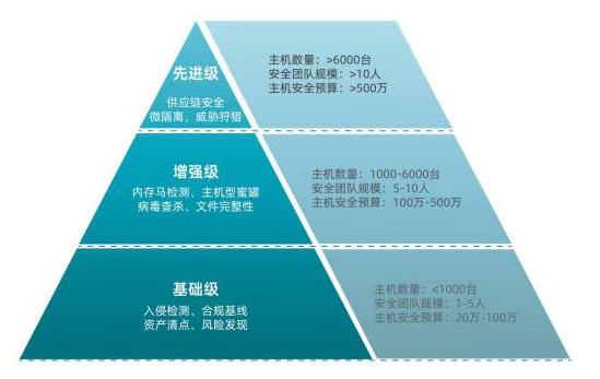 随着攻击手段不断演进,主机安全防护技术也在持续更新迭代,衍生出一系列不同细分类别的主机安全产品,其安全能力按照成熟度以及可匹配的用户需求,可划分为三个级别:基础级、增强级和先进级。