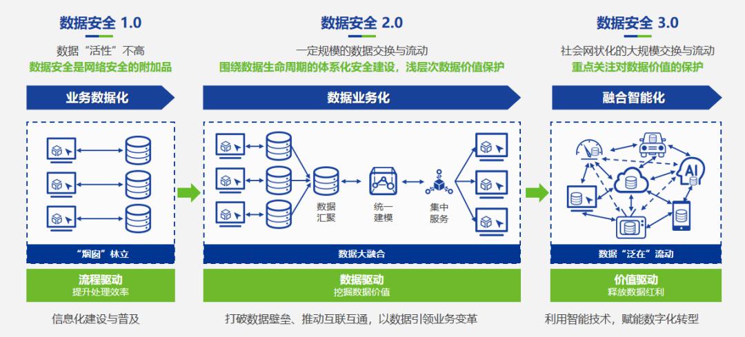 随着 IT 基础架构和法律法规的变化,数据安全已经从「孤岛式系统建设的 1.0 时代」到「数据集成与汇聚共享的 2.0 时代」,现在正步入「聚焦对数据价值全面保护的 3.0 时代」。