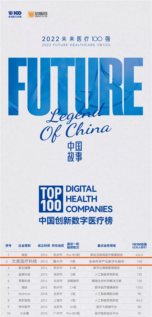 6 月 15 日, 由 VB100、动脉网、蛋壳研究院联合发布的 2022 年未来医疗 100 强榜单正式揭晓。