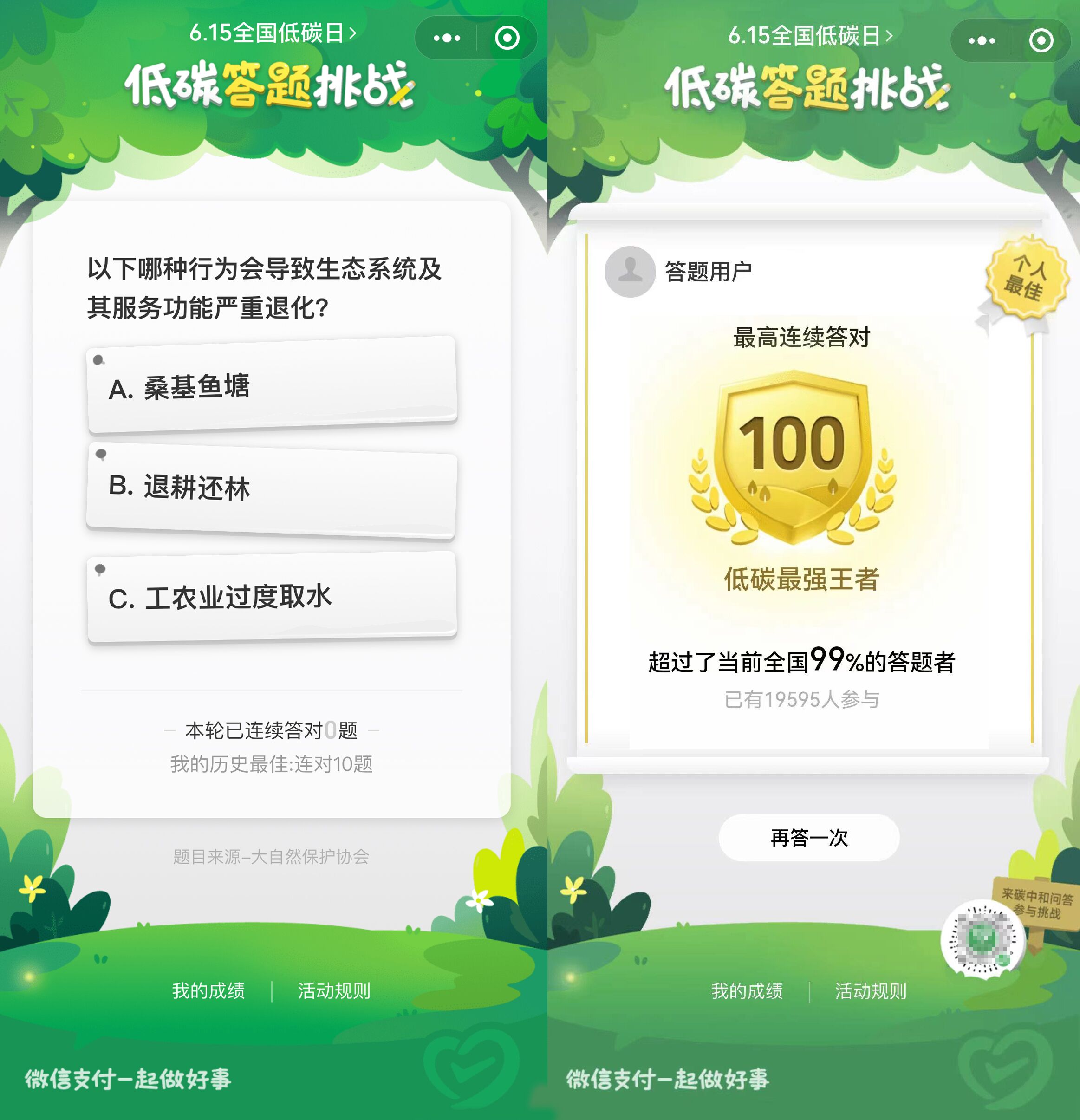 这些问题均来自于微信支付「低碳答题挑战「小程序,旨在让更多人了解低碳知识,参与低碳行动。