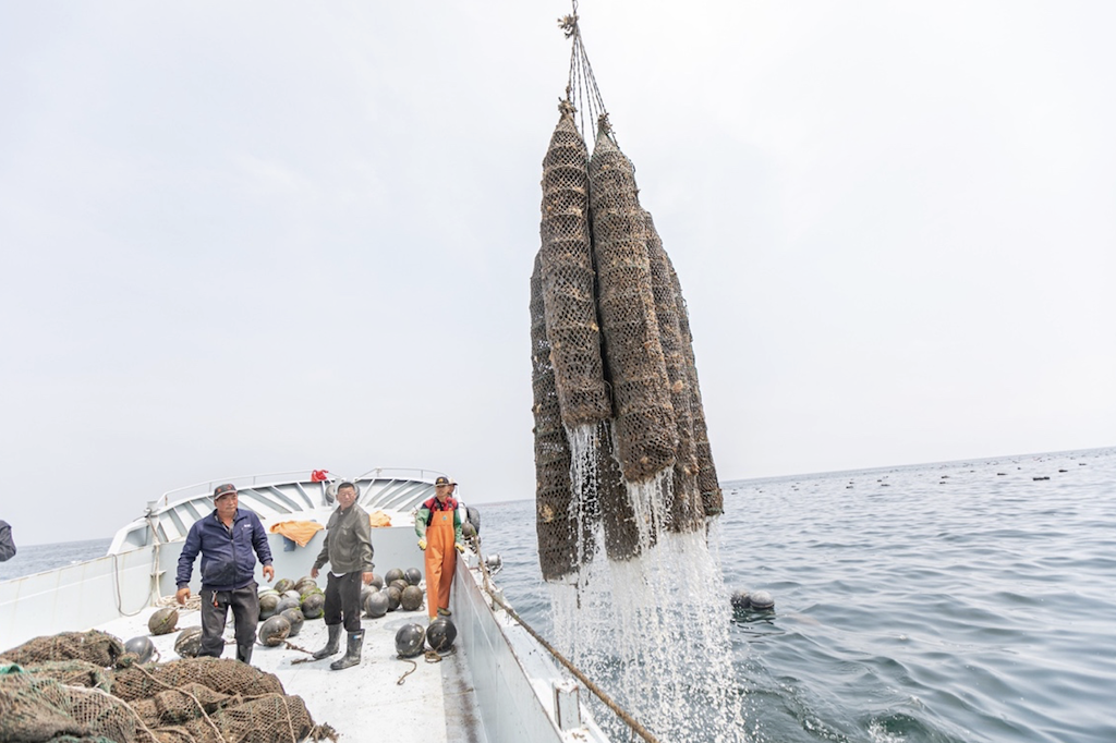 北纬 39°,特殊的地理位置,相比其他海域温度、盐度都更低,比如其他海域盐度在 30% 左右,这里盐度在 26%—28% 之间,是生蚝养殖的极佳「舒适区」。