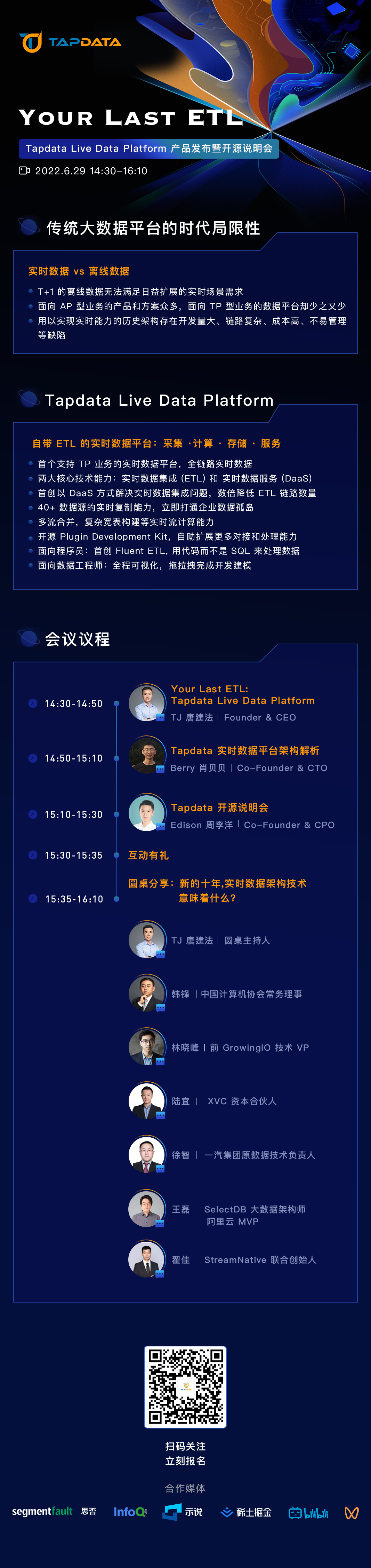 想要了解更多新一代实时数据集成架构的技术细节,以及实时数据领域的前沿发展,推荐关注下周三 6 月 29 日 14:30 的 Tapdata Live Data Platform 产品发布暨开源说明会——纯粹的技术分享,干货式的理念交流,更有实时数据「输送者」和「使用者」等多方代表参与的圆桌论坛——敬请期待!
