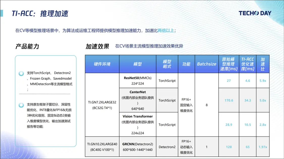 针对推理加速,TI-ACC 能在不影响预测精度的前提下降低 GPU 资源占用率,其加速效果、使用便捷性较市面开源方案均有明显的优势。在产品能力上,TI-ACC 除了可以支持主流的各类模型格式,同时也包含了丰富的推理加速优化手段,相比原始模型,其推理加速比通常达到两倍以上。