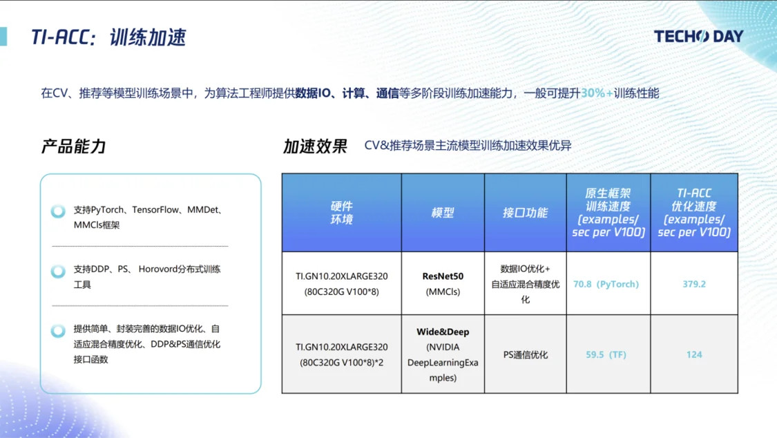 其中,TI-ACC 是本次 TI 平台全新升级发布的重磅功能,也是其强大性能的核心保障。TI-ACC 支持大规模的训练和推理加速,帮助企业和开发者解决了在 AI 加速方面的痛点和需求。