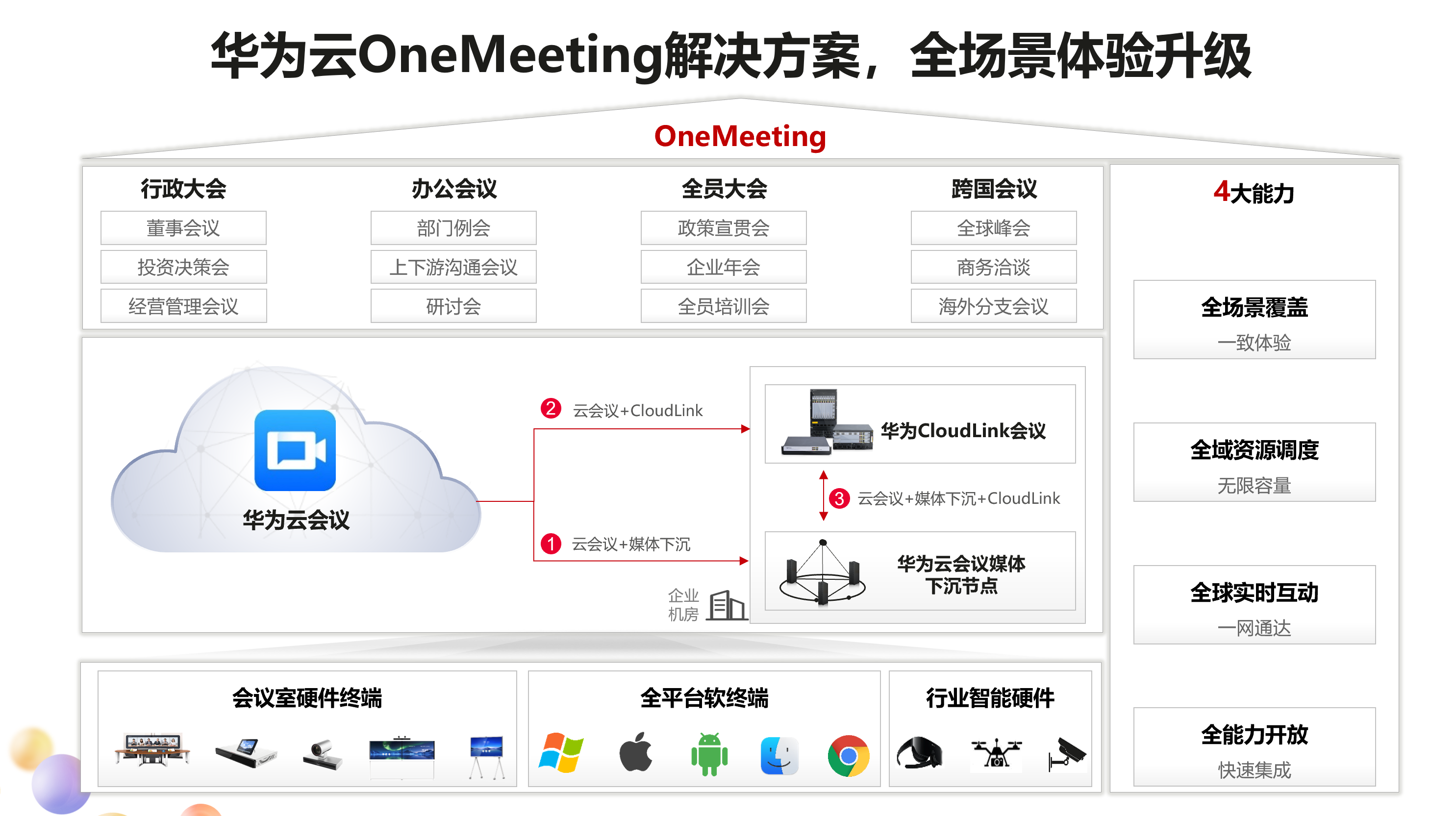 全场景覆盖:对于企业有云会议和私有化会议并存的情况下,往往会有多套系统平台,存在体验不一致、使用复杂等问题。华为云 OneMeeting 解决方案,提供统一会议 ID、统一 APP、统一体验标准、统一会管会控,化繁为简,实现一致的用户体验。