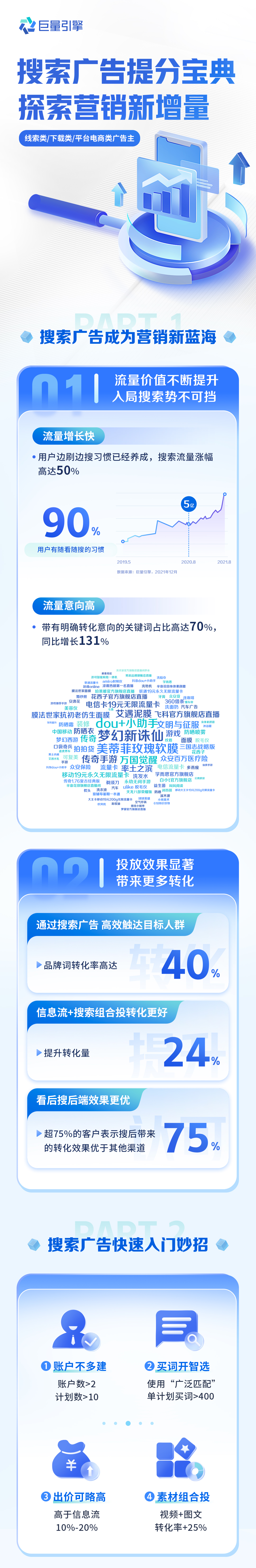 对此,巨量引擎推出搜索广告提分宝典,梳理账户、买词、出价、素材等策略,帮助线索、下载、平台电商类广告主更好的拿到营销成效。