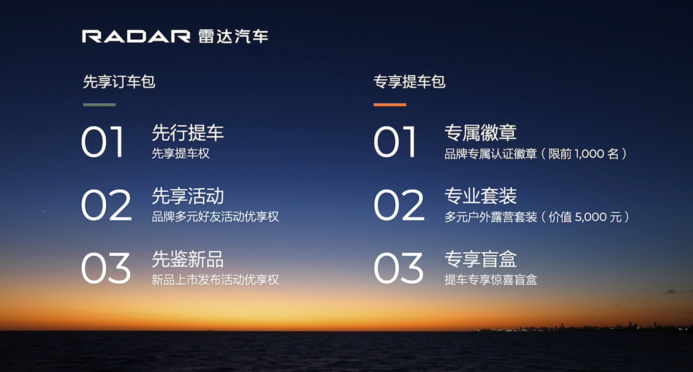 准车主福利进行时!雷达 RD6 将于今年上市,现在「0 元预定」通道已开启。首批预订用户,可享受优先提车权、品牌多元好友活动优享权、新品上市发布活动优享权等先享订车礼包,还可获得雷达汽车官方 App 品牌专属认证徽章、惊喜盲盒、价值 5000 元的多元户外露营装备等专享提车礼包。即刻,开启多元户外精彩生活。