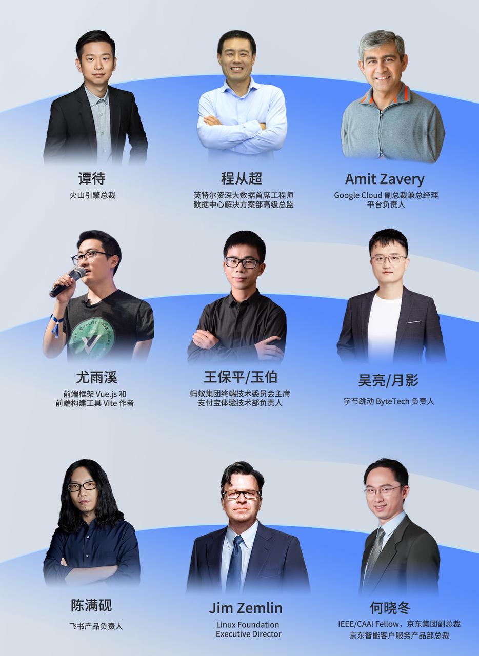 火山引擎总裁谭待为大会做了开场致辞并预祝大会圆满成功。英特尔资深大数据首席工程师、数据中心解决方案部高级总监程从超;Google Cloud 副总裁兼总经理、平台负责人 Amit Zavery;Linux Foundation 执行总裁 Jim Zemlin;IEEE/CAAI Fellow、京东集团副总裁、京东智能客户服务产品部总裁何晓冬;前端框架 Vue.js 和前端构建工具 Vite 作者尤雨溪;蚂蚁集团终端技术委员会主席、支付宝体验技术部负责人王保平 (玉伯);字节跳动 ByteTech 负责人吴亮 (月影);飞书产品负责人陈满砚等 9 位大咖嘉宾在大会主论坛上做了精彩的技术趋势、开源生态与产业发展的前沿分享,给万千开发者带来了一场知识堆栈溢出的盛会。