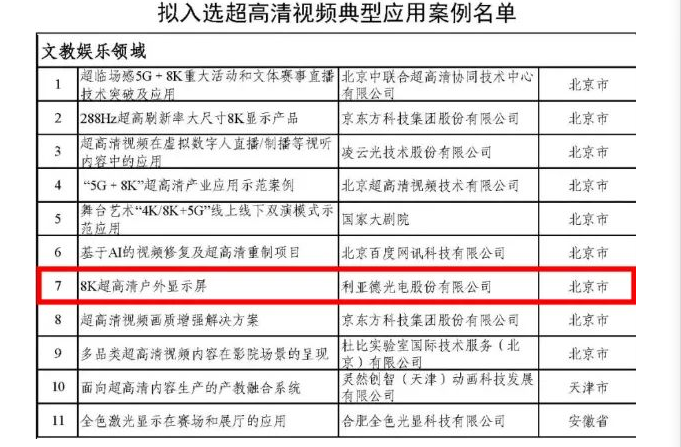 利亚德「8K 超高清户外显示屏」项目上榜国家级超高清视频典型应用案例名单