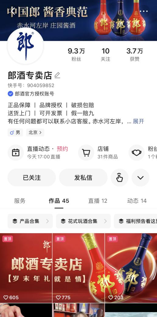 不同于其他短视频平台,常能看到其它酒类品牌不同层级经销商的卖力吆喝,郎酒入驻快手前,只选择了一家经销商,同时匹配 1 个官方旗舰店和 2 至 3 家专卖店的渠道矩阵,集中优势资源快速开局。