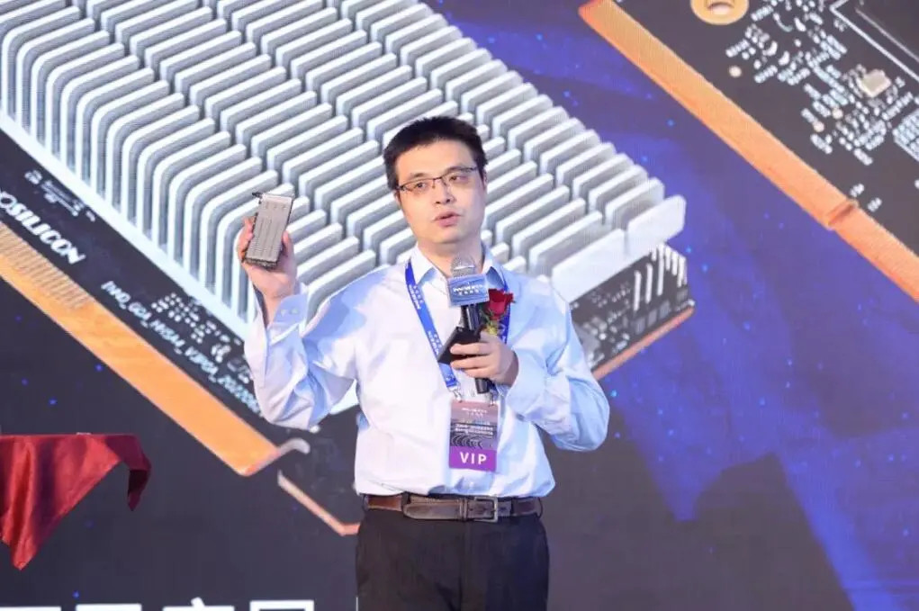 ▲芯动科技 CEO 敖海展示了采用「风华 2 号」GPU 芯片的无风扇板卡 (3-5W 工作功耗下)