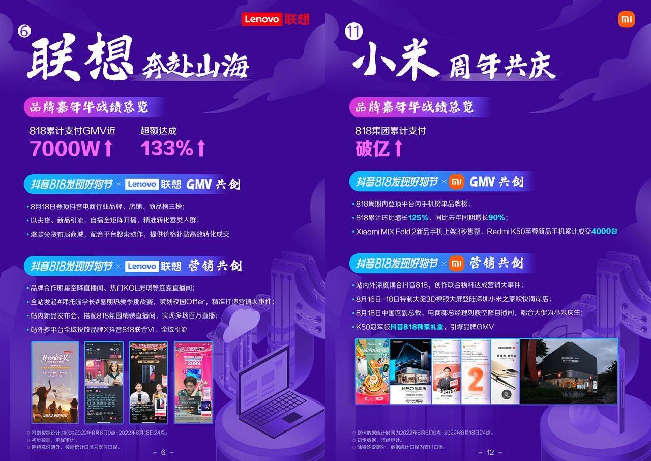 营销共创方面,充分发挥平台短视频立体呈现、话题挑战赛吸引互动等优势,联动线下资源同频共振,提升传播声量和消费热度。小米集团、联想等品牌便是很好的例证。大促期间,小米集团站内外深度耦合抖音 818,创作联合物料,为活动引流;8 月 16 日-18 日,特制大促 3D 裸眼大屏登陆深圳小米之家欢快海岸店;8 月 18 日,中国区副总裁、电商部总经理刘毅空降自播间,耦合大促为小米庆生,提升活动热度;活动期间,小米集团还发布了 K50 冠军版抖音 818 独家礼盒,引爆品牌 GMV。联想则结合暑期消费特征,全站发起 # 拜托啦学长 # 暑期热爱季挑战赛,策划校园 Offer,精准打造营销大事件;站内新品发布会搭配 818 氛围精装直播间,实现多场百万直播;站外多平台全域投放品牌 X 抖音 818 联合 VI,全域引流。