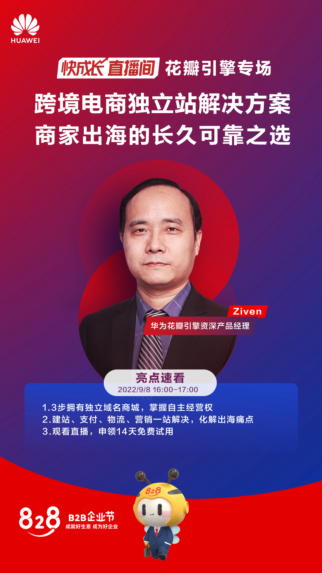 华为云 828 B2B 企业节系列直播为企业打造学习、成长的平台,每一期都有资深专家分享企业成长干货,解决企业在成长过程中遇到的问题,同时还有各种不同力度的直播间专属优惠。本期花瓣引擎直播将为观众带来独立站免费试用 14 天的专属福利,名额有限,先到先得!