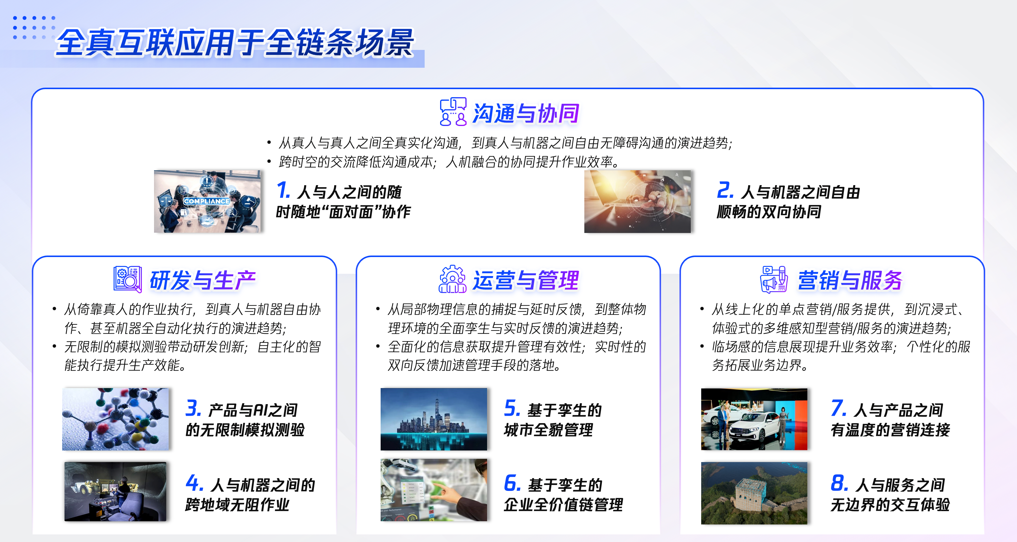 全真互联不仅可以支撑人和组织的能力边界延伸,也能帮助产业发展进化到全域全真的数实融合新模式。白皮书认为,全真互联在沟通协同、研发生产、运营管理、营销服务等产业全链条中都有巨大的应用潜力。