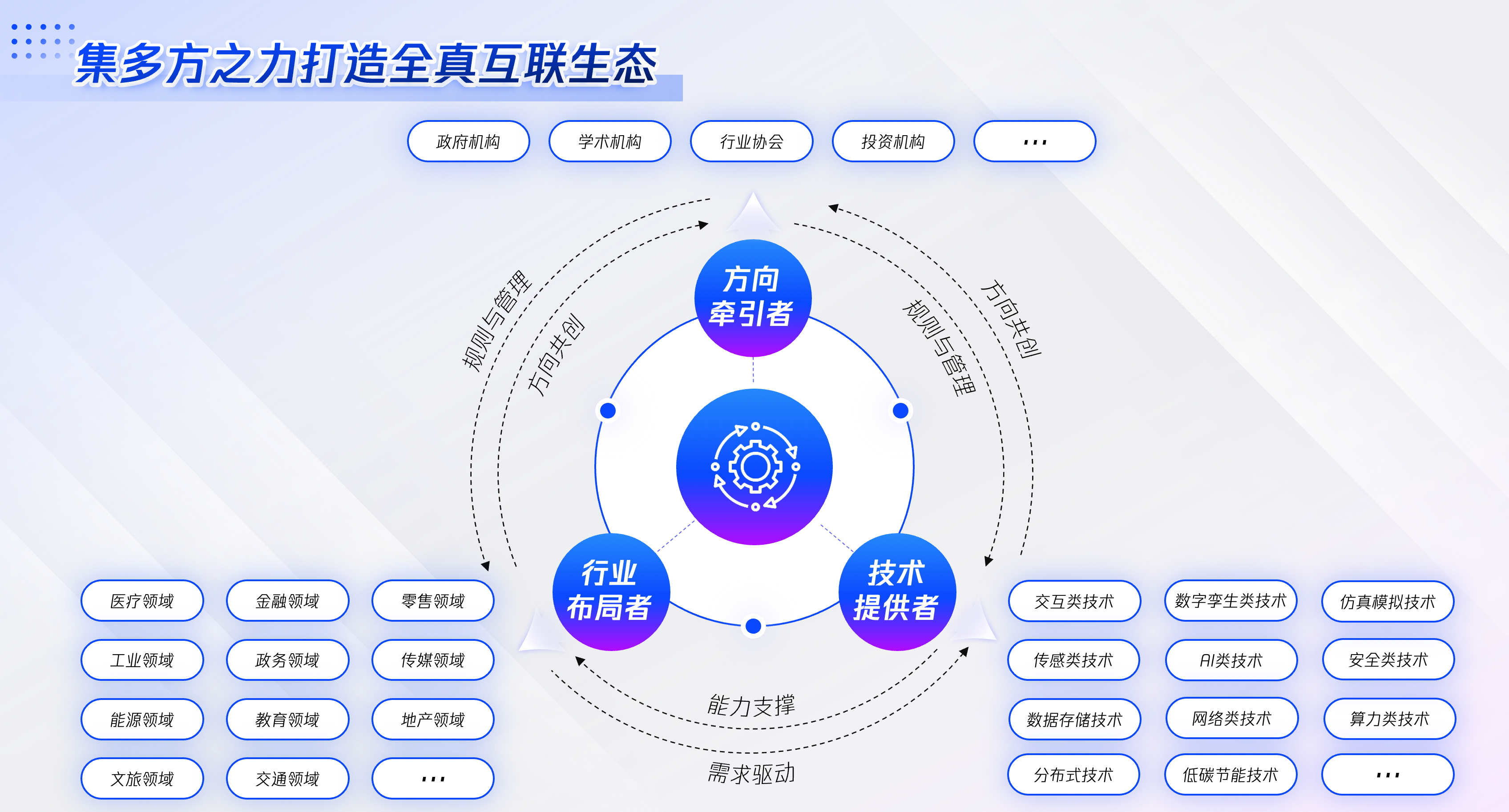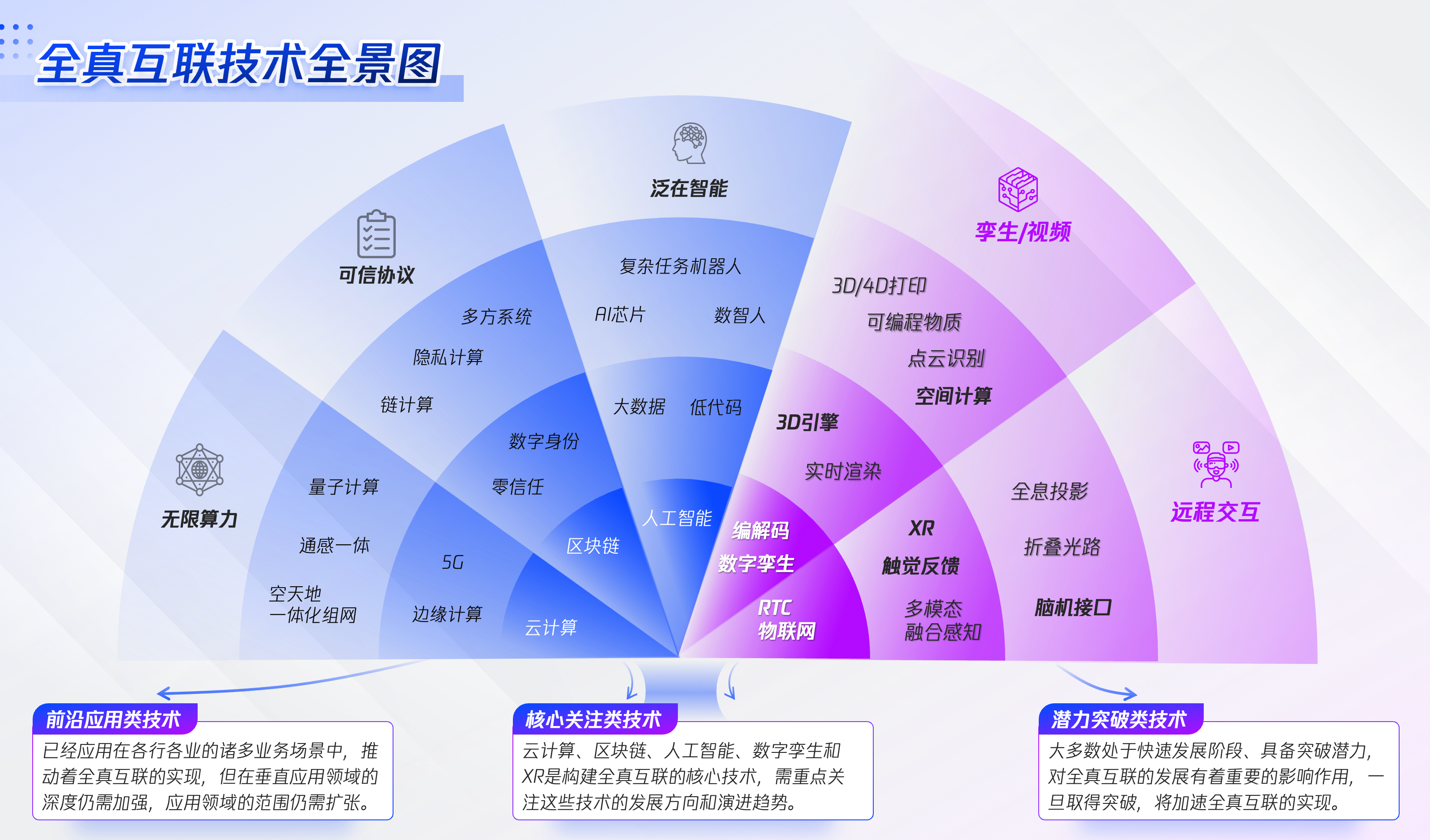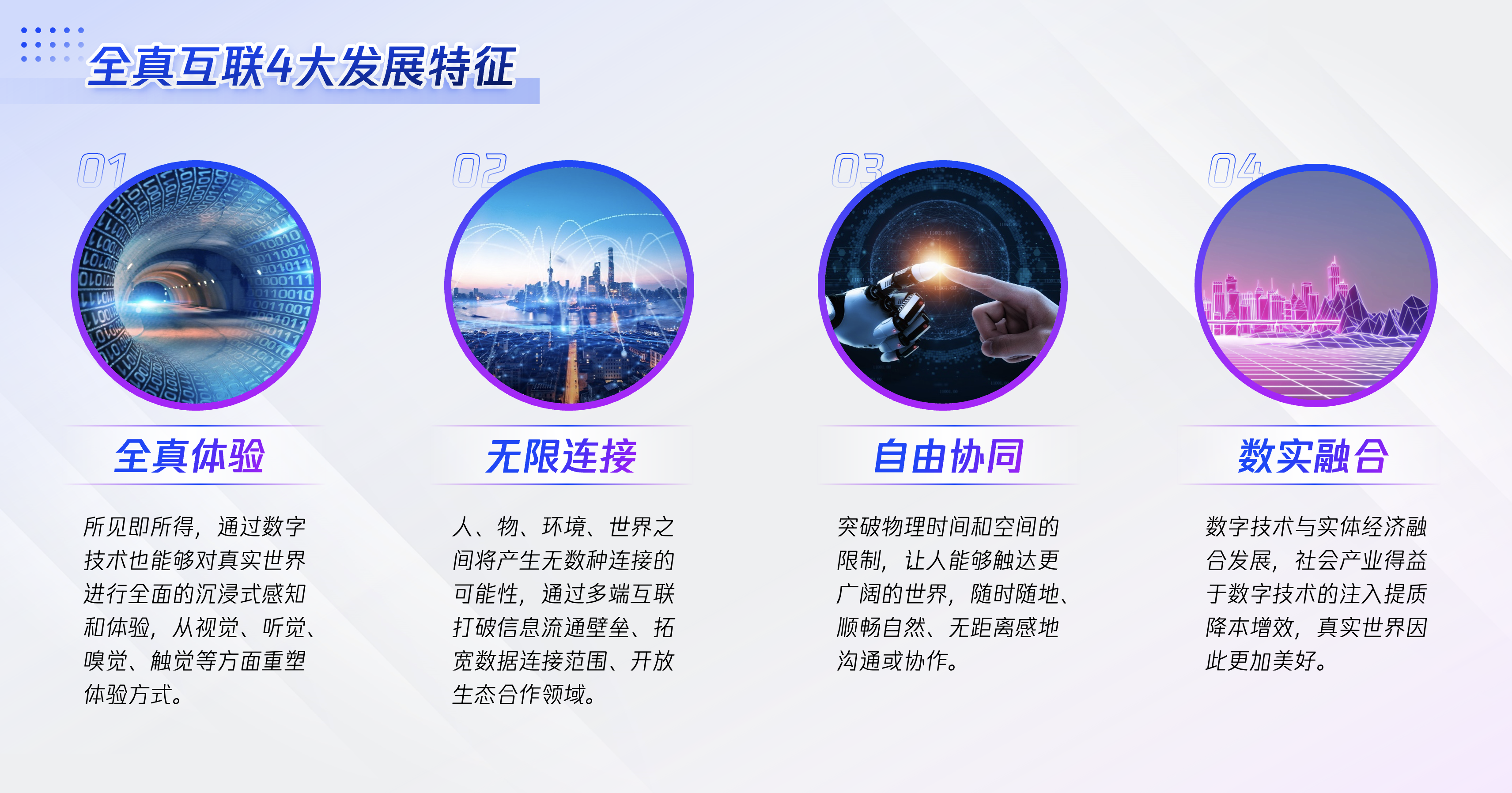 全真互联以全真体验、无限连接、自由协同、数实融合为主要发展特征。人们能够对真实世界沉浸式感知和体验,产生无限连接的可能性,突破物理时间和空间限制自由协作,数字技术和实体经济也将充分融合发展。