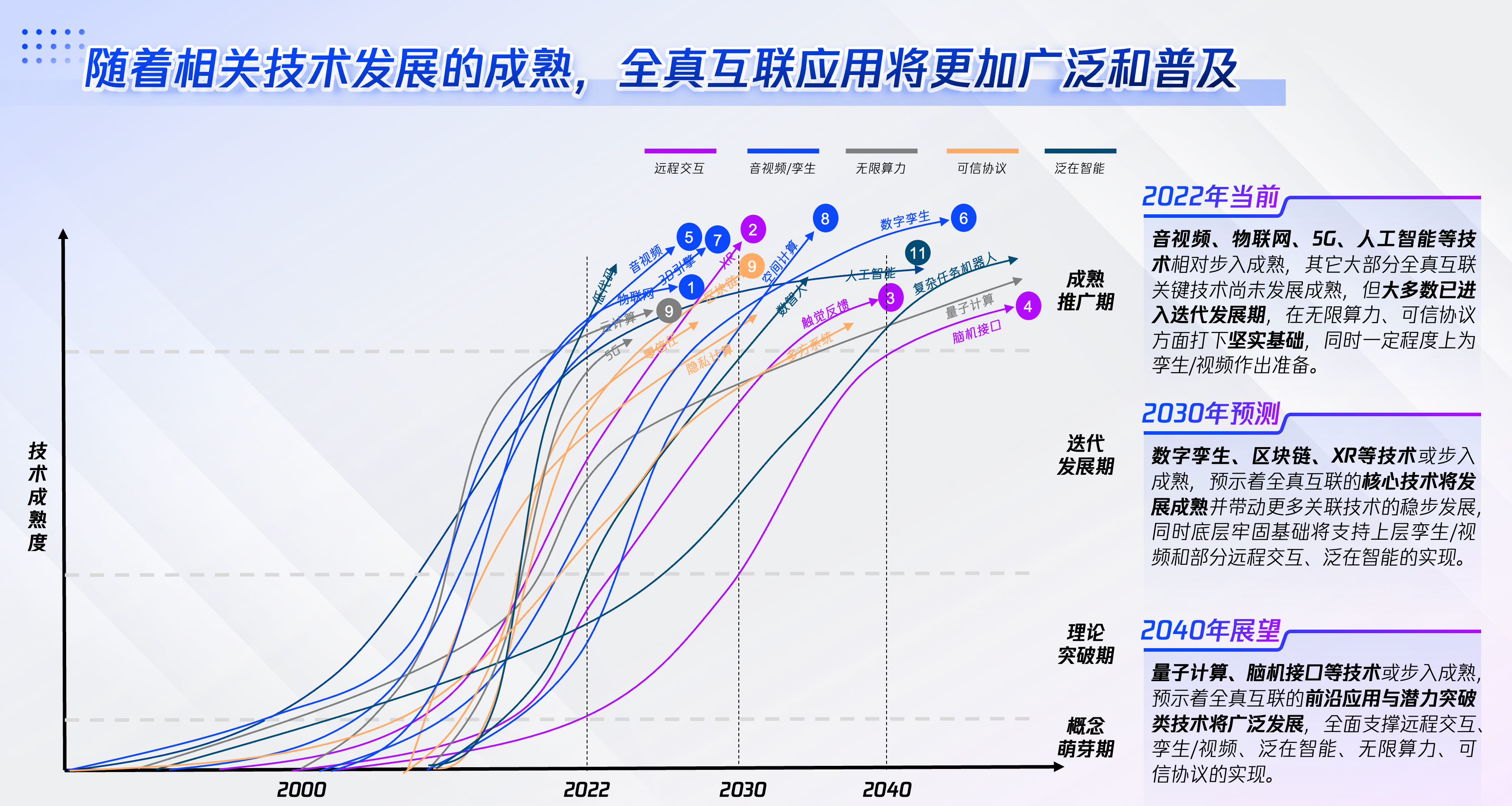 白皮书认为,音视频、物联网、人工智能、数字孪生、区块链、XR 等技术已经相对成熟或高速发展中。预计 2040 年,量子计算、全息投影、折叠光路、脑机接口等前沿技术有望迎来进一步突破,支撑全真互联全面应用。