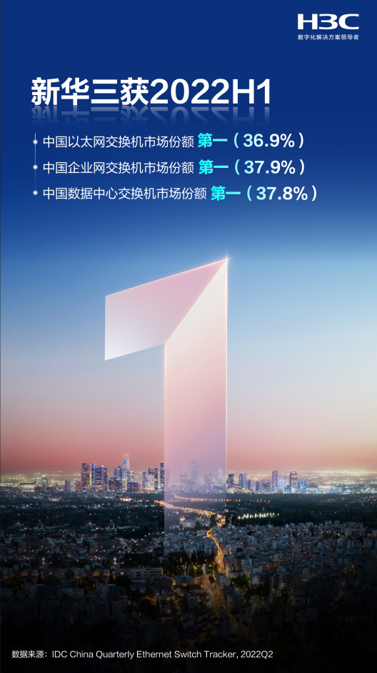 近日,国际数据公司 IDC 发布《中国以太网交换机市场季度跟踪报告(2022Q2)》。在 2022 年上半年,紫光股份旗下新华三集团以 36.9% 的份额位居中国以太网交换机市场第一,以 37.9% 的份额中国企业网交换机市场第一,以 37.8% 的份额位居中国数据中心交换机市场第一,实力诠释了中国网络市场领导者地位。