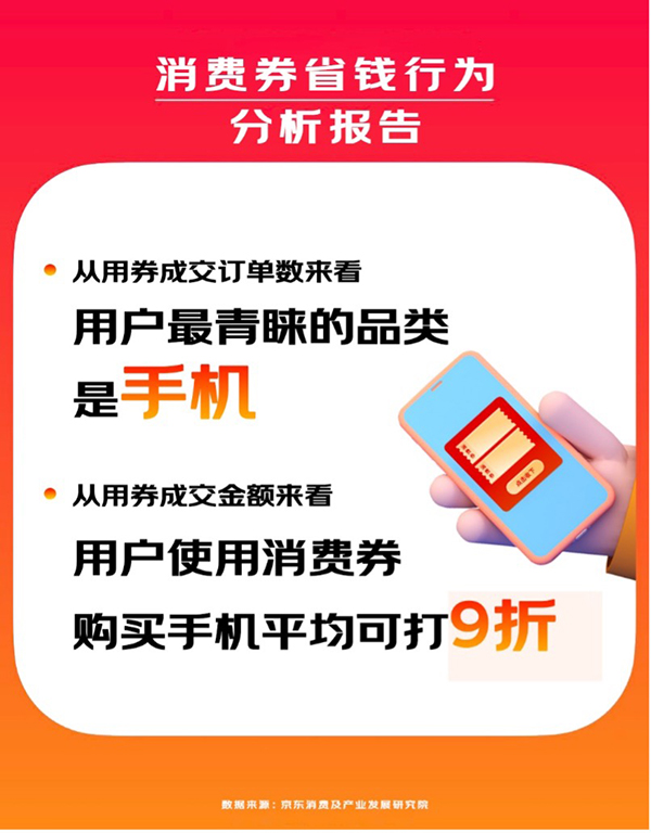 目前,内需依然是拉动我国经济增长的主要动力,消费是第一驱动力。今年上半年,从国家到地方密集出台政策举措激活消费市场,发放消费券成为重要方式之一。据数据统计,全国累计发放消费券超过百亿元,消费者领取消费券后都有哪些消费行为?近日,京东手机联合京东消费及产业研究院共同发布了《消费券省钱行为分析报告》,从用券成交订单数来看,用户最青睐的品类是手机;从用券成交金额来看,用户使用消费券购买手机平均可打 9 折,且不分价位段、不分人群,只要符合消费券使用规则就可在京东实在购买手机。同时,为给用户更实在的购机体验,今年京东 11.11 还带来了全场至高 24 期免息、爆款产品买贵 1.2 倍退差、以旧换新至高补贴 1600 元等实在福利。