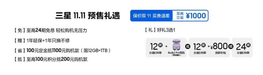 目前三星网上商城的双 11 优惠活动已经正式开启。现在通过三星网上商城预售活动下单三星 Galaxy Z Fold4,可享免息分期,以及包括三星 Galaxy Buds2 Pro 在内的好礼三选一等多重预售优惠。此外,消费者选购指定型号还可享至高 100 元抵 1100 元的定金膨胀礼遇。这个双 11,就让三星 Galaxy Z Fold4 带你进入「高效抢购模式」吧。