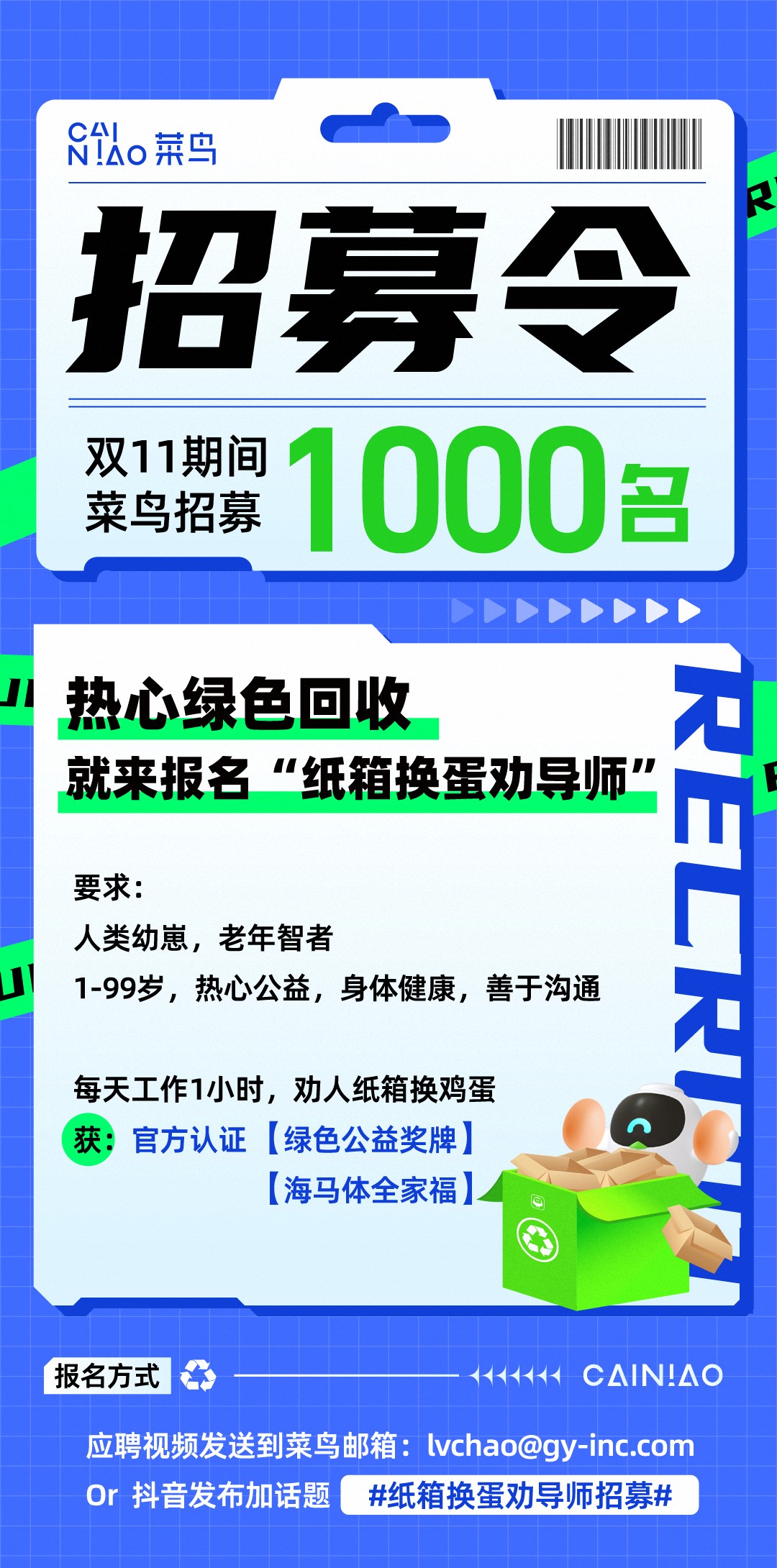 为了打消大家的疑虑,菜鸟希望通过招募官方认可的「纸箱换蛋劝导师」,在驿站现场为消费者普及环保知识,协助消费者参与绿色回收。