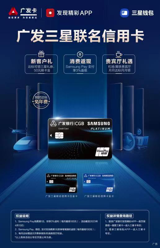 申领成功后, 用户即有机会参与「广发三星联名信用卡新客发卡礼」与「广发三星联名信用卡消费返现」活动。
