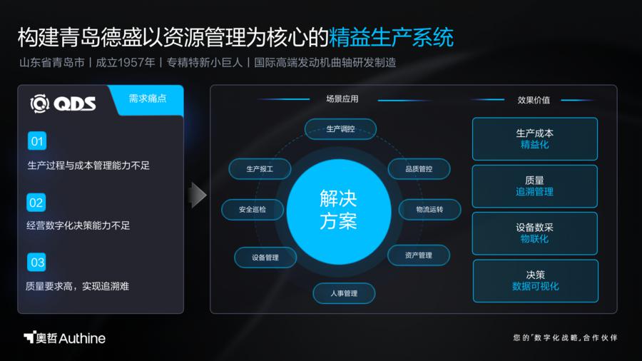 以制造行业为例,青岛德盛是一家成立于 1957 年的专精特新小巨人企业,主要从事高端发动机曲轴的研发制造,产品已出口到三十多个国家和地区。以精益生产为核心,青岛德盛借助奥哲低代码围绕生产端搭建起生产报工、生产调度、质量管理、设备管理、物流转运、资产管理、原材料检验等十余套系统;实现工人、设备、原材料、产品、叉车等所有 " 人、物、场 " 的在线化及数字化,打通原有信息孤岛,实时收集并统计全量数据,真正做到全透明管理与运维。