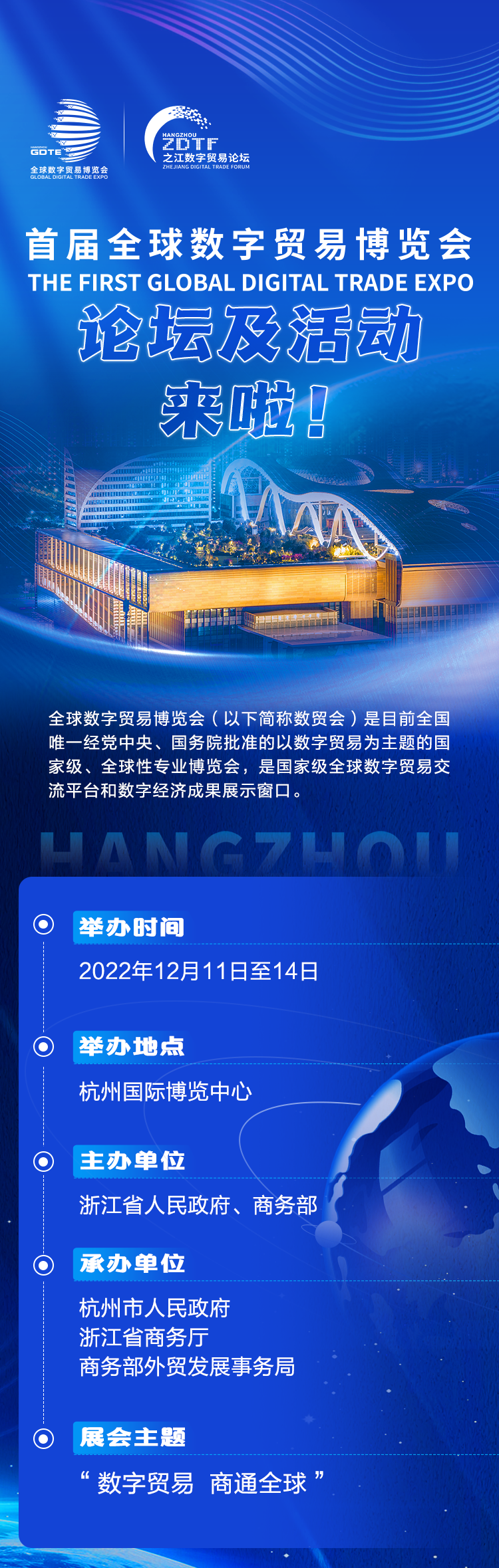 全球数字贸易博览会(以下简称「数贸会」)是我国唯一以数字贸易为主题的国家级、全球性的专业展会。首届展会将于 2022 年 12 月 11 日-14 日在杭州国际博览中心举办,以「数字贸易 商通全球」为主题,聚焦打造数字贸易产业发展风向标的目标定位,依托浙江数字经济的先发优势,设置会议论坛、展览展示、成果发布、互动体验等活动。
