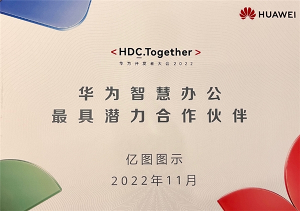 据悉, 华为开发者大会 2022 以「创新照见未来」为主题, 通过开发者主题演讲、松湖对话、技术论坛等形式, 带来了鸿蒙生态的新进展、新格局。作为华为终端业务面向开发者群体举办的科技盛宴, 华为开发者大会 2022 在万物互联的世界为开发者和合作伙伴打开新流量、新入口、新机会。其中, 特别设置的「华为智慧办公最具潜力合作伙伴」奖, 旨在表彰智慧办公领域, 合作伙伴作出的杰出贡献。