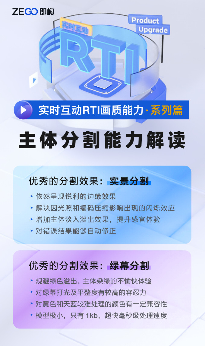 ZEGO 即构科技发布的主体分割能力均为客户端主体分割,具体可以细分为两种:实景分割、绿幕分割。
